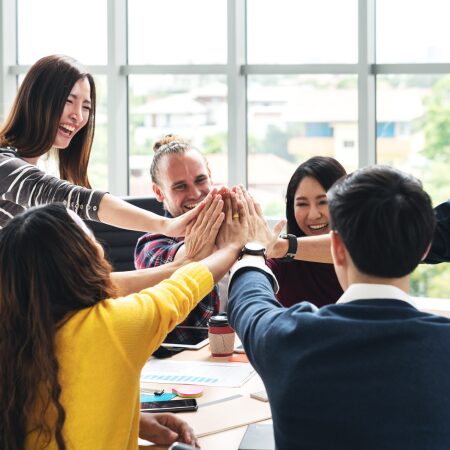 複数のメンバーがデバイスを使いながら会議を進める様子。伴走支援や実践的サポートを象徴するイメージ。